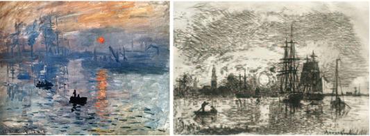 荣金德是荷兰早期印象派的重要画家、版画家。他描绘的海景具有早期印象派风格,他是最早运用点画笔触造型的画家,至少要比前面提到的毕沙罗早15年。实际上并不是每位印象派大师都擅长版画制作,印象派注重色彩与光线,而雕刻版画在色彩上是受局限的。莫奈一生就没有成功制作出一副版画,但是他的名作《印象·日出》(左图),灵感就源自于容金德的这张版画《在安特卫普港》(右图),表现的是安特卫普港的落日风景。莫奈看到这幅版画作品后,以自我的手法重新创作了《印象·日出》,成为艺术史上不可缺的伟大作品。加歇是一位精神科医生,与许多印象派画家都有交情,他既是画家毕沙罗和塞尚的朋友,本人还是一位热衷绘画的业余艺术家。他的作品本身并不出名,但作为艺术家的朋友,他却不可忽视。这幅《吊死者之屋》(左图)与塞尚的一幅作品同名(右图),本次展览中还展出了一幅塞尚所绘的《加歇医生之家》,足见加歇与画家之间的情谊之深厚。
