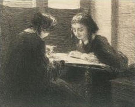 拉图尔是浪漫主义与印象主义之间的过渡性人物。他的人物画既具有古典学院派的严谨写实风格,又不乏印象派的光影效果。《刺绣女工们》(右图)细腻的光影效果使得画面空间和人物具有如油画般的写实性