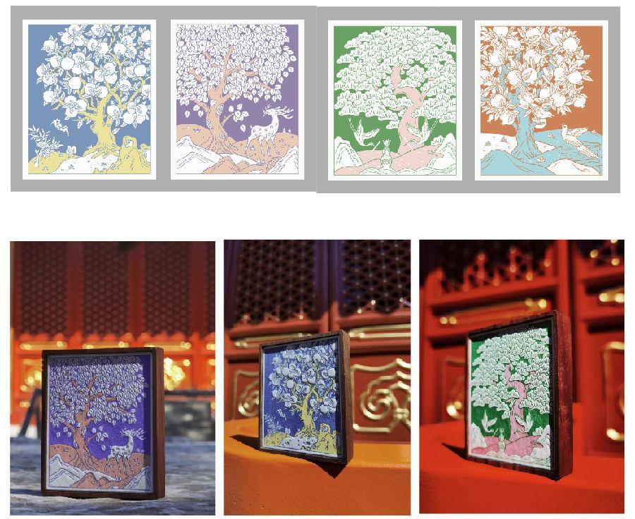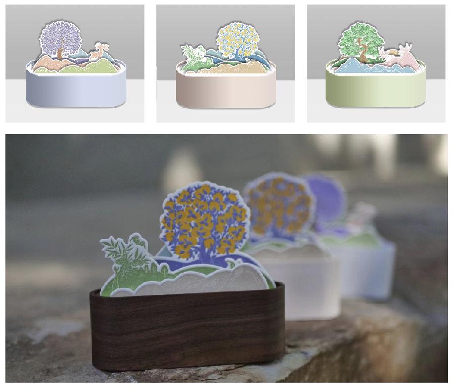 寿文化凝聚了人们对生的礼赞和生命永续的向往,吉物祥瑞香薰既是吉祥的征兆,又可养颜怡性,也可视为一种高雅陈设,作品结合浪漫主义审美特点,在我们的传统文化中代表吉祥如意的鹿、仙鹤、蝙蝠、金钱树、桃、松树,可以带来吉祥好运,作品采用中国传统色彩体系,结合凸版印制和异形模切的工艺,以简捷明快的图形化语言与社会大众沟通,突破局限,让优秀的传统文化内涵能够融入进日常使用的文创产品中,同时结合现代材料与先进的加工工艺,从而设计出造型简约优美,同时富有生活趣味化的实用性创意产品。