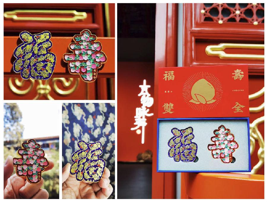 福寿双全冰箱贴灵感来源于博物馆内的文化元素。福字与山门顶部彩绘洪福齐天元素结合,寿字与寿桃结合,组成福寿双全冰箱贴,福寿双全是中华传统文化中一个非常重要的概念,它代表着人们追求幸福长寿并且永保平安的心愿,这是人们对于完美人生的期望。在中国的传统文化中,福寿双全被视为最高的境界,是人们一生追求的最高目标。包装盒设计采用中国红和传统蓝撞色设计,视觉效果突出。