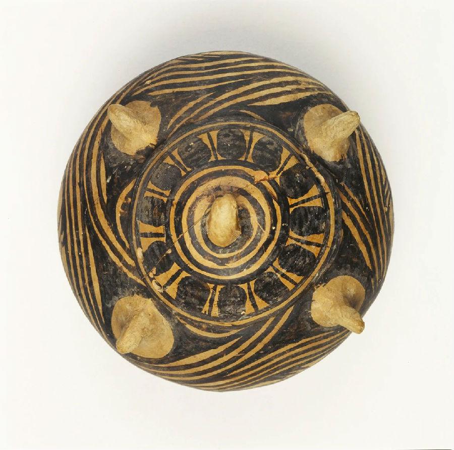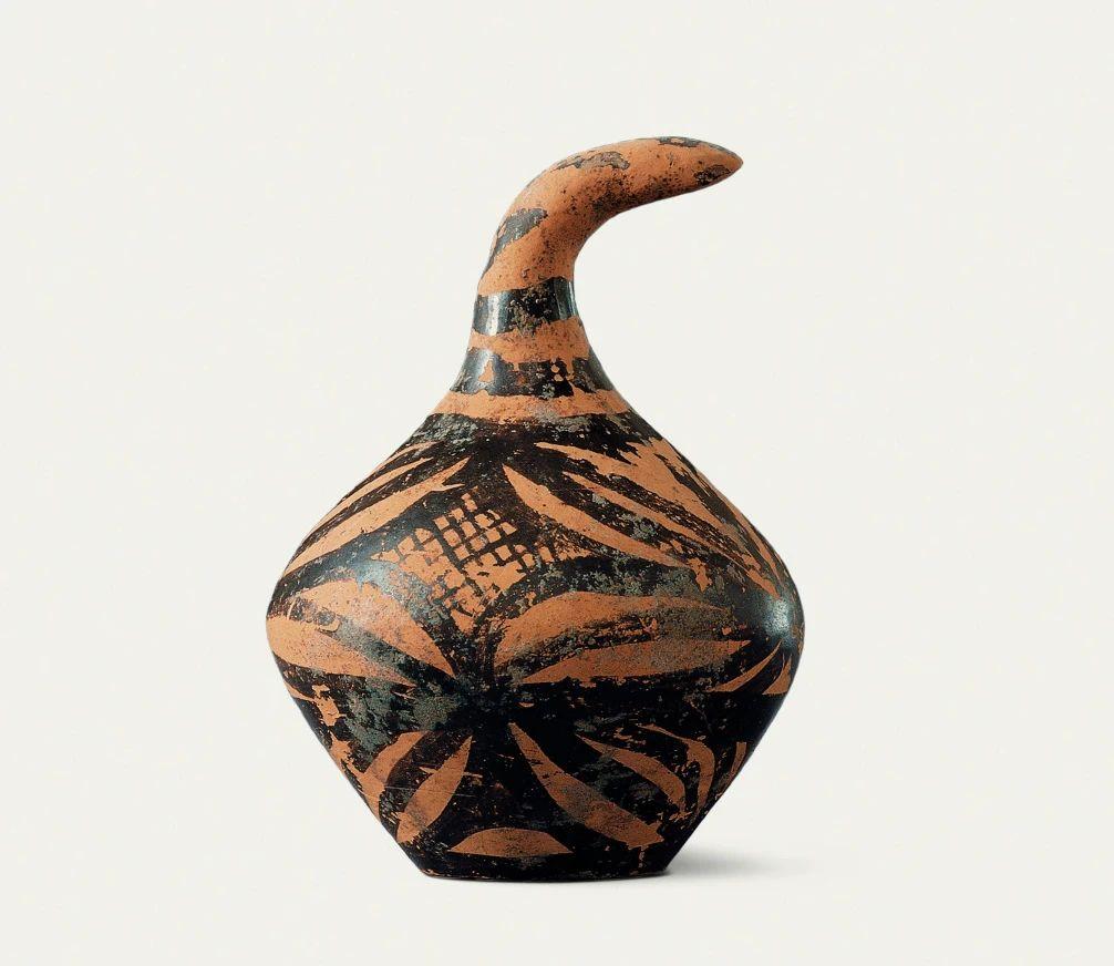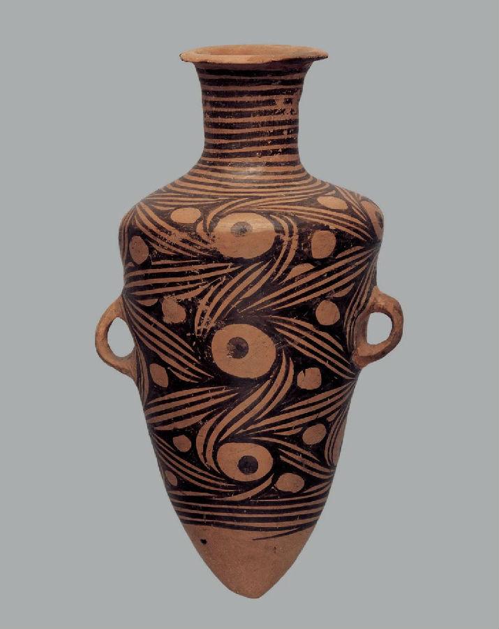 该器施黑彩,颈部绘平行弦纹,肩部以下绘三组连续旋涡纹。小口尖底瓶是仰韶时代的典型器物,漩涡纹是马家窑文化的标准纹饰,两个时代特征的融合,体现了后世对前代文化的一种追忆。这件小口尖底瓶器形不大,纹饰却比同时代同等大小彩陶器的装饰图案要繁缛、华美,表明这件器物可能具有某种礼仪性的功用,不是日常生活用品。