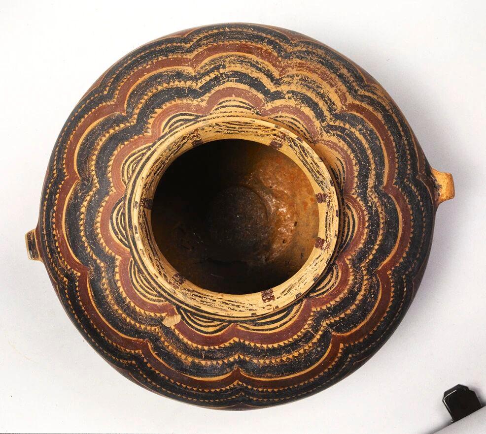 马家窑时代的陶器多放在地面上或土台上,因此人们以俯视角度观看彩陶。这件半山类型的彩陶瓮从侧面看是用黑红复彩层层描绘连续的垂弧纹,正面俯视则是一只盛开的美丽花朵。它是甘肃彩陶艺术鼎盛时代华美与绚丽的代表之作。