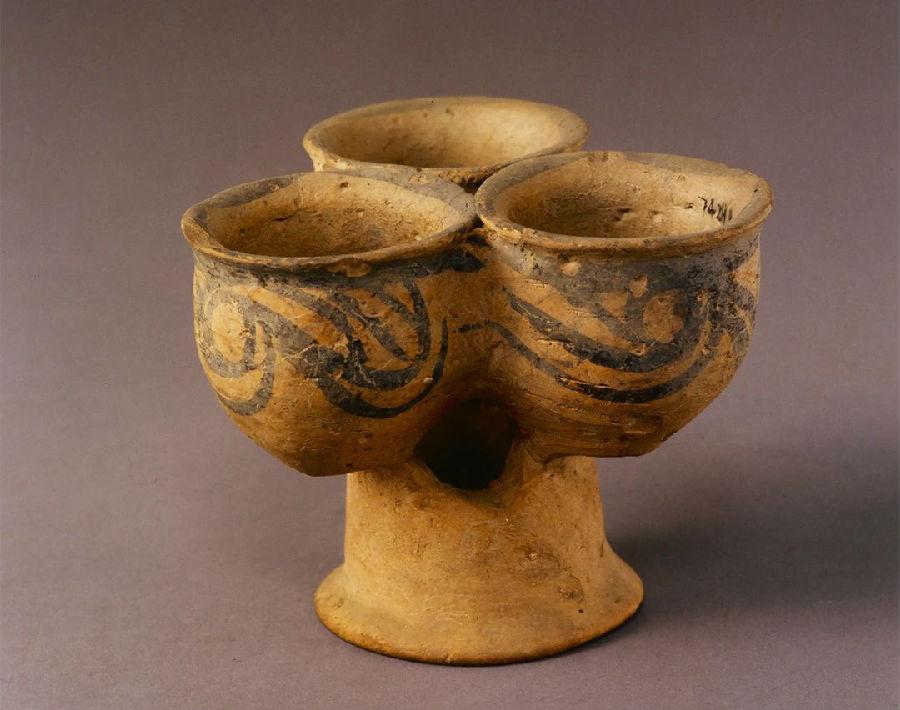 三联杯造型突破常规,每杯独立呈现二方连续旋涡纹样,构图严谨且富有动感,高圈足设计增强稳定性。其将实用功能与装饰艺术结合,体现制陶工艺的创新与纹饰技法的精湛,是新石器时代彩陶艺术的典型代表。