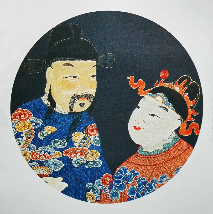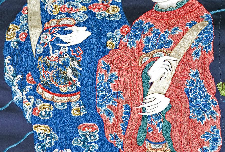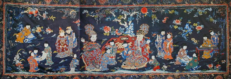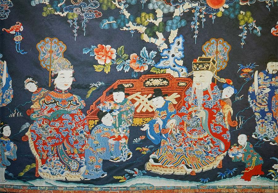 这是一幅精妙的观赏性绣品。画面正中天官夫妇含笑而坐,天官身穿大红云龙官服,头戴金冠;夫人则凤冠霞披,雍容华贵。子孙手捧寿桃、寿酒侍立于侧;左右是前来贺寿的文武百官,作弈棋、抚琴、赏画之状;背景有日月、松藤、牡丹、桃枝、蝙蝠等,祥和吉庆。