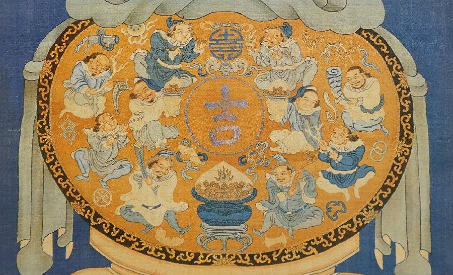 在蓝色的背景下,一只系着彩带的金地大葫芦立于木架之上,葫芦内有两组人物。上部为八仙童子,八名儿童手持八仙宝器;下部十位仙人各持珊瑚、海螺等宝物。圆心部位用金、银线缂【大】、【吉】两字,有软螺钿效果,在光线下闪耀出多种颜色。人物面部、衣饰只缂出轮廓,眉目、衣服纹饰均用笔绘。