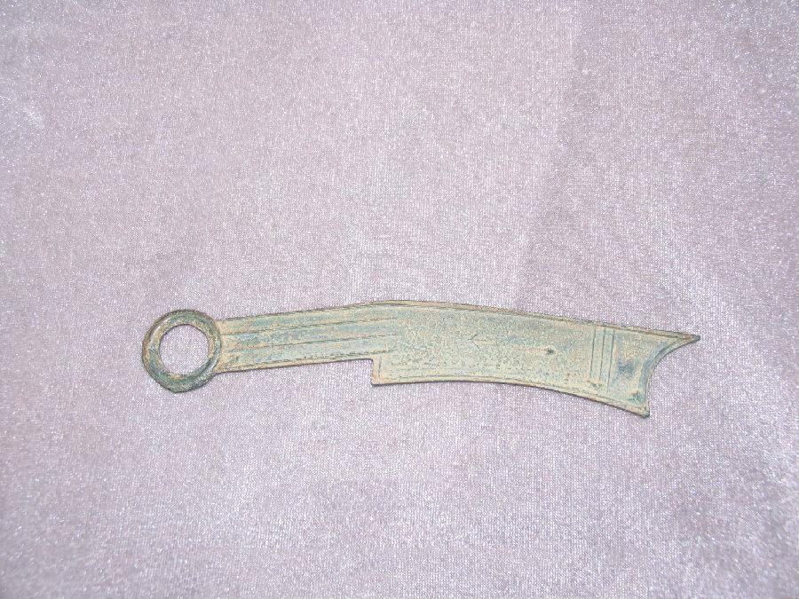 馆藏品“安阳之法化”刀币,春秋时期所制,长462.5px,宽75px,厚0.3 cm,铜质,形似刀。刀面边缘起棱,形轮廓线。刀身弧背,脊背外突,形角。刀柄上亦起两条阳线,柄端装饰圆环,篆阳文“安阳之法化”。背平夷,上有三条阳线,下文为一字,或二字,字已模糊不清。
