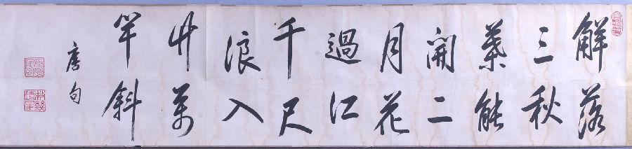 北京艺术博物馆珍藏有许多中国清代帝后的书画作品,这其中不仅包括康熙、雍正、乾隆三位皇帝的书画佳作,也有慈禧太后精心绘制的花鸟画。这些作品反映出清代皇室对书画的热衷。我们看到的这幅书法作品是康熙御笔五言唐诗手卷,为纸本,纵31厘米,横184厘米。手卷上写有“解落三秋叶,能开二月花;过江千尺浪,入竹万竿斜。”这首诗是唐代诗人李峤所写《风》,诗的字里行间把风的特点描写得十分贴切,而且充满想象力。康熙皇帝的书法自然疏朗,笔画富于变幻,充满张力,与李峤诗句的意境结合得十分完美。