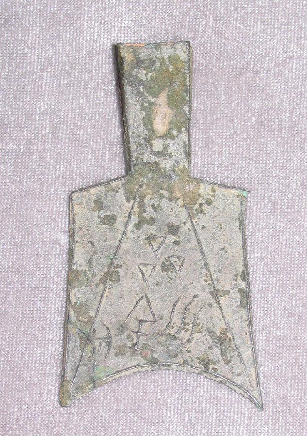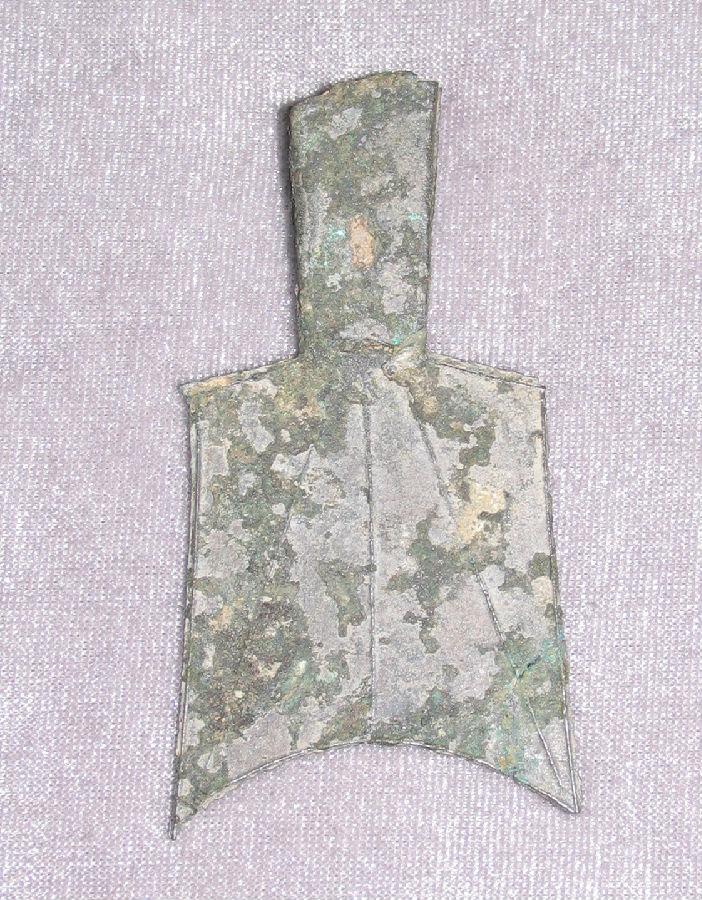 平首布,铸造晚于空首布。因布上端銎无孔,称其平首。形状多,如:“平肩平首布、方肩平首布、方足平首布”等。