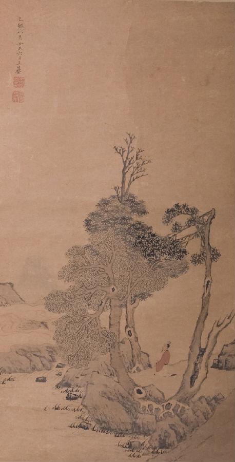 艺博馆藏明代画家王綦的纸本设色《杜甫诗意图轴》,画中描绘了潺潺溪水边,一位红衣文士端坐于萧疏的树下远望,墨线勾勒线条,淡笔设色,整个画面安静闲适,秀润简远。款识:已卯八月二十六日,王綦。