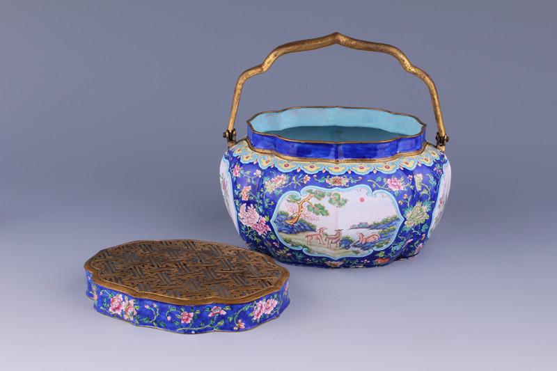 明清时期珐琅器主要有两种,一是源自波斯的铜胎掐丝珐琅,约在蒙元时期传至中国,明代开始大量烧制,并于景泰年间达到了一个高峰,后世称其为“景泰蓝”。此后,景泰蓝就成了铜胎掐丝珐琅器的代称。另一种是来自欧洲的画珐琅工艺,它在清康熙年间始传人中国。作法是先在红铜胎上涂白珐琅,入窑烧结后,在其平滑的表面以各色珐琅料及金绘画图案,再经焙烧,制成富有绘画意趣的艺术品。