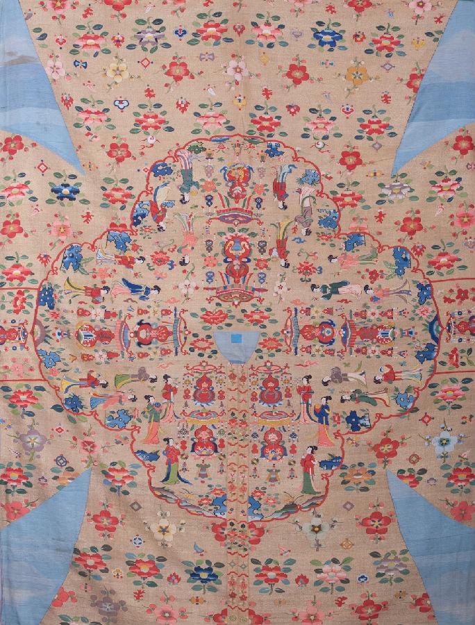 北京艺术博物馆收藏的金地缂丝灯笼仕女袍料即是明代的一件缂丝珍品。此袍料长179厘米,宽133厘米,为圆领对襟式,襟缘饰花卉纹镶边,宽袖。衣身以领口为中心作柿蒂形轮廓,柿蒂内缂织灯笼和仕女纹样,间饰湖石、花卉。灯笼分四组呈十字形排列,除前身一组灯笼为两挂分列两襟外,其余三组各为一挂,每挂两盏。灯笼为葫芦形状,内有各种象征富贵、如意、平安、福禄的吉祥图案,顶盖两侧垂挂葫芦、杂宝缨络,寓意祥瑞喜庆。仕女分散排布于灯笼周围,均上衣下裳,长裙及地,臂挽披帛,衣裳颜色各异,样式也不尽相同。她们或束手而立,或作欣赏花灯状,或把玩手中各式杂宝瑞花,姿态娴雅,娉婷婉丽。柿蒂外缂织有折枝牡丹、梅花等,间隙饰各色杂宝。袍料通身以捻金线缂地,金线直径仅0.2毫米,色纬捻度较强,双股并用,经密16根/厘米,纬密52根/厘米。缂织中使用了长短戗、木梳戗、勾缂等多种表现手法。整件袍料用料贵重,缂工细致,质地紧密,色彩搭配和谐自然,华而不俗,纹样设计别具匠心,典雅又不失活泼,充分体现出明代缂丝精湛的织造工艺。