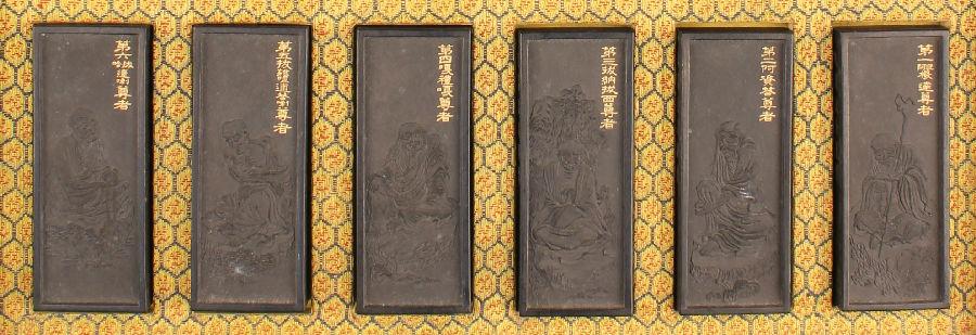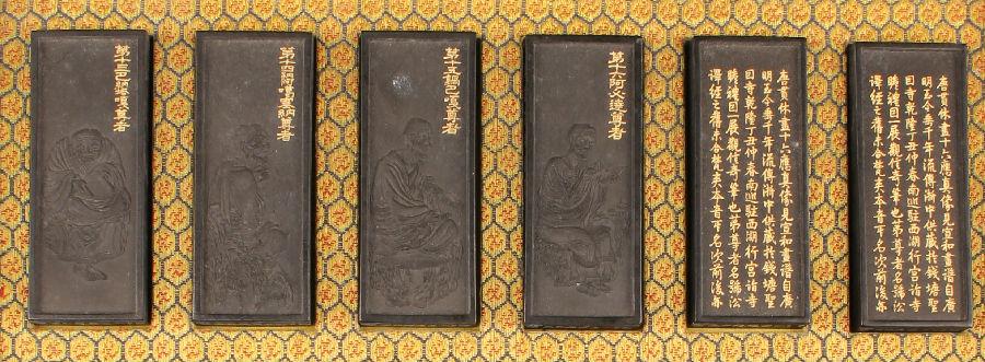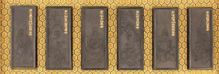 北京艺术博物馆收藏有一套清乾隆御制罗汉赞集锦墨,一盒十八锭,各墨均为长方形,装于黑漆描金双龙纹盒内,双龙对峙,中间篆书“御制罗汉赞”。墨分三排摆放,第一锭、第二锭相同,题有乾隆皇帝御制文“唐贯休画十六应真像,见宣和画谱。自广明至今垂千年,流传浙中,供藏于钱唐圣因寺。乾隆丁丑仲春南巡,驻西湖行宫。诣寺瞻礼,因一展观,信奇笔也。第尊者名号,译经之旧,未合梵夹本音,其名次前后亦与章嘉国师据梵经所定互异,爰以今定同文韵统合音字,并位次注于原署标识之下,各题以赞,重为书签,仍归寺中,传世永宝。夫四大本无,画于何有。乃斤斤于名相文字之别,得毋为诸善者所诃耶。御识。”