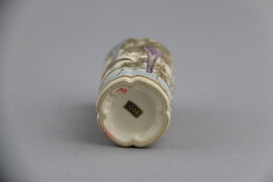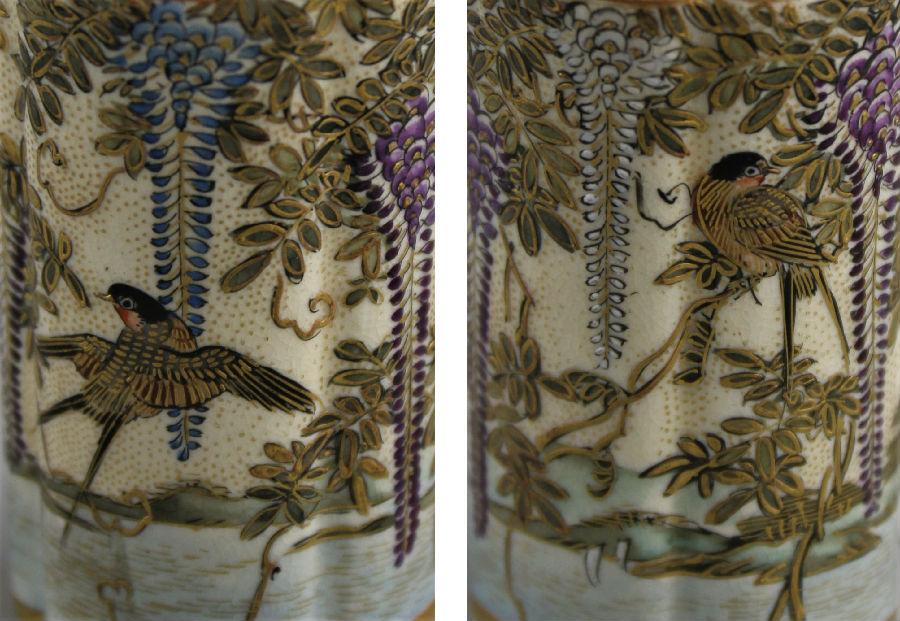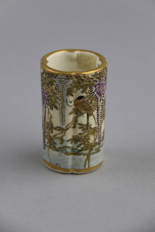 北京艺术博物馆藏萨摩烧金襕手紫藤燕子纹茶筅立座是萨摩烧的典型器物。茶筅立座为日式茶道的工具之一,用于放置茶筅,多为圆柱形,这件立座通高5.4厘米,直径3.2厘米,圆柱形器身上对称四凹棱,器底有片假名书写“萨摩”两字。器身以米黄釉为地,釉面上带有细碎开片,上面绘画出紫藤和燕子的图案。紫藤有蓝、紫、白三色花瓣,燕子或穿行于花间或栖于枝蔓,远景搭配青绿色的山与湖。最引人注目的是整个器物使用大量金彩装饰——立座的口沿和底部、紫藤的花蕊、藤蔓的枝叶、燕子的羽毛、山的轮廓、湖水的波纹均以金彩点缀。细腻的画面和大量金彩的运用使得小小的立座看起来精致无比。