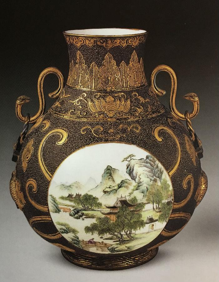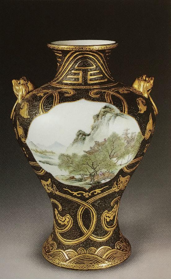 器型整体呈斛桶式,撇口、粗颈、溜肩、垂腹、圈足。肩部置对称如意形耳,耳下塑贴卍字、双鱼、磬,呈璎珞样式,具有立体感很强的浮雕装饰效果,表意“吉庆如意”、“万年有余”,构思新颖、寓意吉祥。描金刻花装饰遍布器身,包括外壁口沿的如意云头纹、颈部的蕉叶纹、肩部的卷草纹和蝠纹、腹部的变形凤纹以及圈足的几何线条。描金刻花与黑色的铁骨泥胎对比鲜明、相得益彰,使器物呈现金属质感,高贵古雅。腹部两面各有一个圆形开光,内绘青绿山水人物,勾描细致,设色浓重,具有绘瓷名家张志汤风格。外底红彩篆书“江西陶专精制”六字款识。