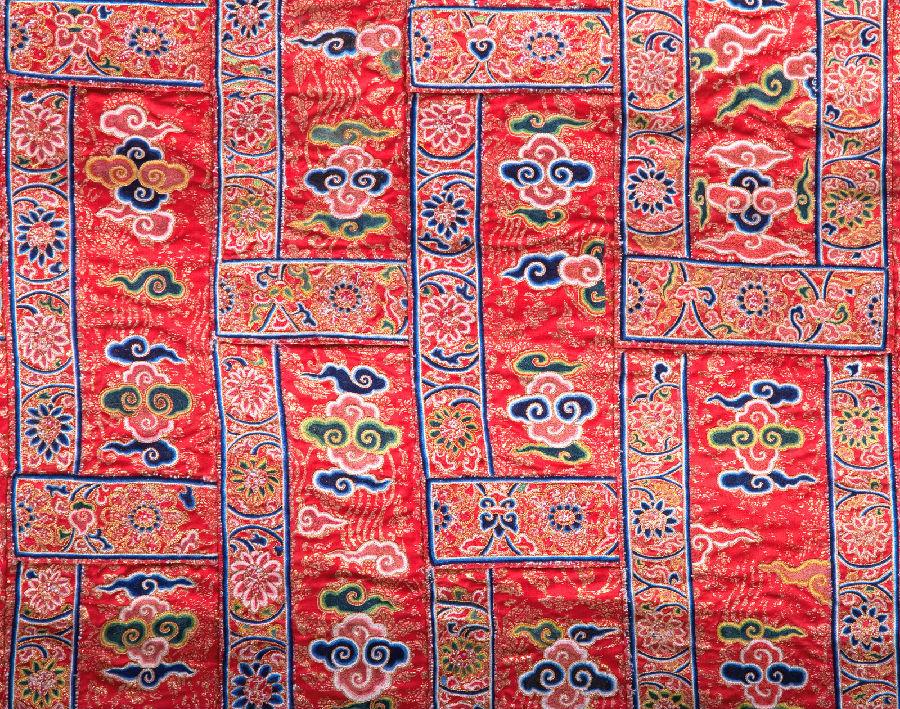 北京艺术博物馆收藏着一件上品祖衣,明代红色织金缎地缉线绣缠枝花四合如意云纹袈裟,尺寸为264厘米×143厘米。此袈裟是用二十一条四长一短凤穿牡丹织金缎裁片缝制而成,片金线闪耀夺目。