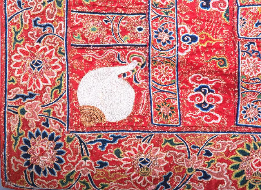 隔条内绣缠枝菊花,田格内绣四合如意朵云,四角用白线、金线各绣法螺一只。