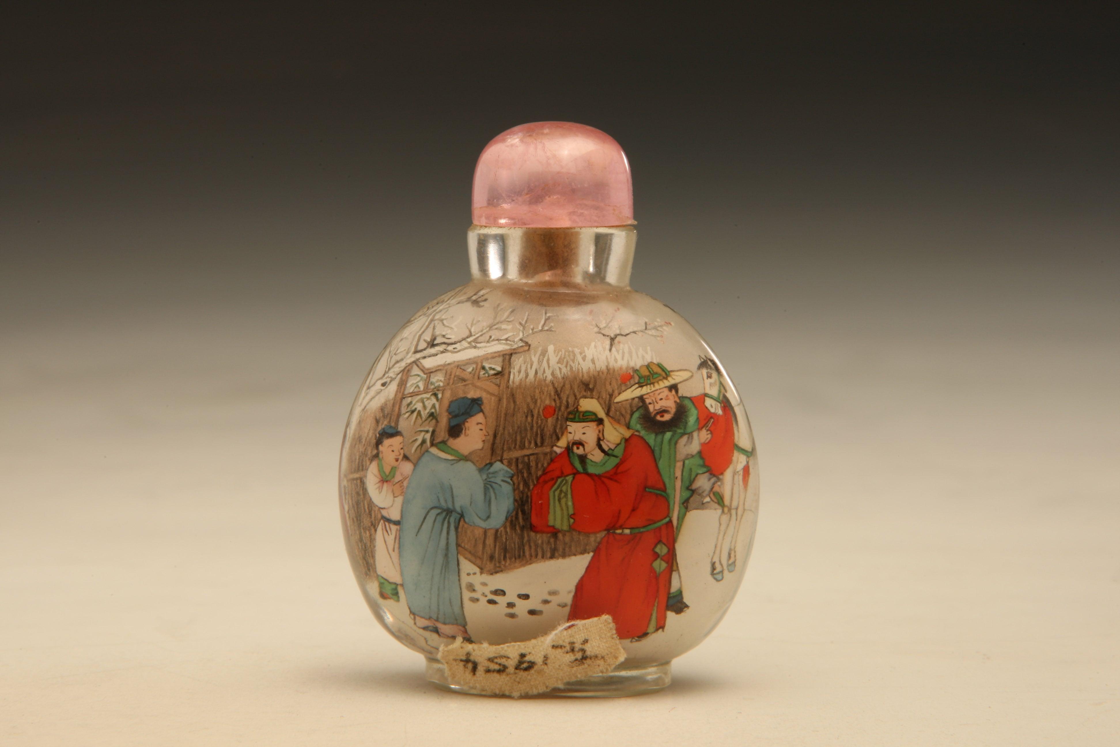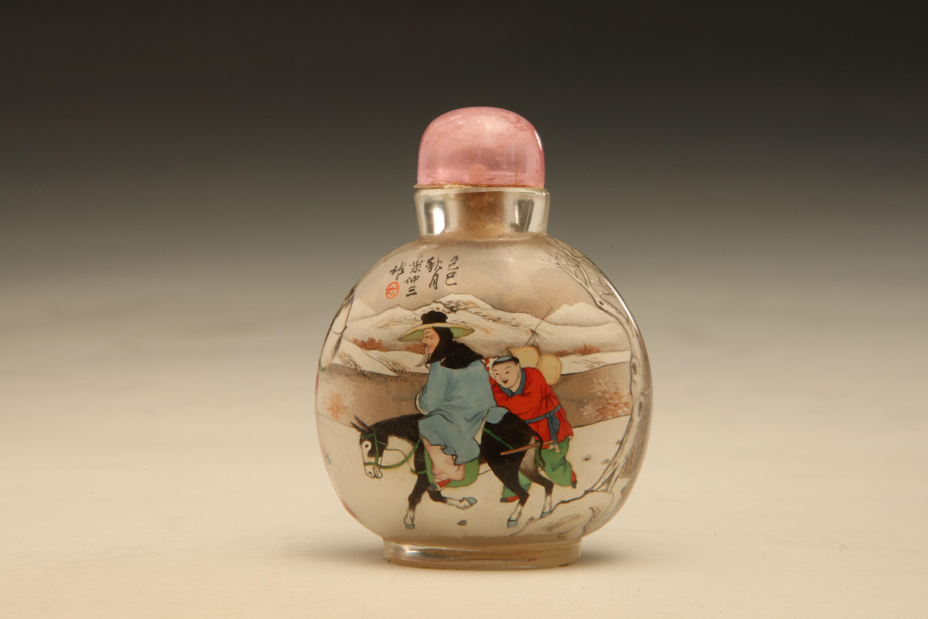 烟壶以水晶制成,口微外撇、腹鼓、椭圆形圈足。采用中国独有的内画技术,于鼻烟壶正面描绘了刘备等人第二次踏雪前往隆中,邀请诸葛亮出山以助其完成恢复汉室江山的宏图大业。画中人物表情生动,刘备虽未见到诸葛亮,但仍对其弟诸葛均恭敬有礼,突出了刘备礼贤下士、求贤若渴的心情。背面绘一老者骑驴,一小童肩扛酒葫芦紧随其后,驴作抬腿奔走状。色彩鲜艳,人物传神。左上方落款“己巳秋月叶仲三作”。配粉色碧玺盖。