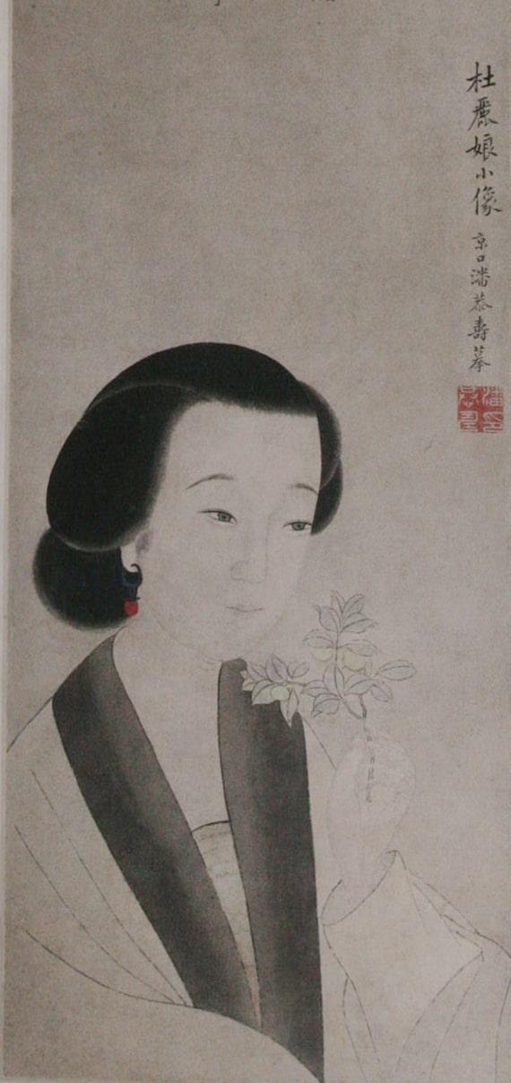 杜丽娘原本是明代话本小说《杜丽娘慕色还魂记》中的人物,后因汤显祖的《牡丹亭》而闻名于世。画面描绘杜丽娘拈枝闻香的场景。整幅画画意简洁却十分传神,画法精致,用水墨以没骨法画人物,线条勾勒衣纹。全画除所持花枝等略染花青外,仅耳环为红色染成,在设色上可以说画家独具心思,使画面效果更清新脱俗。