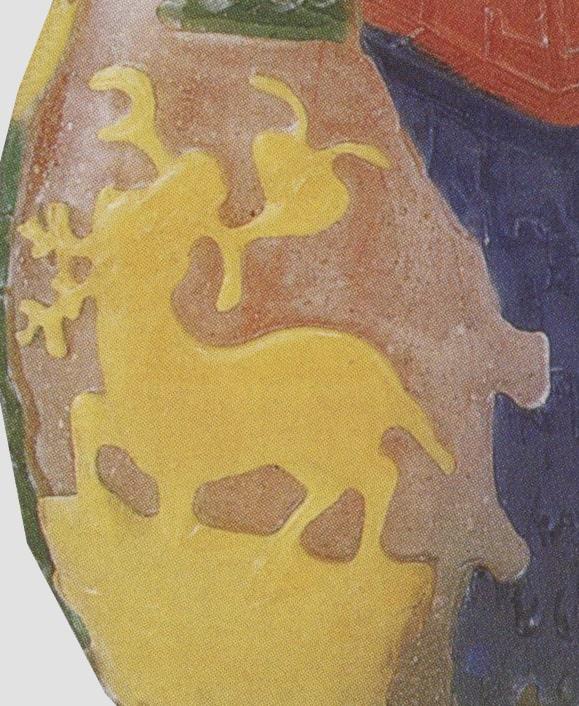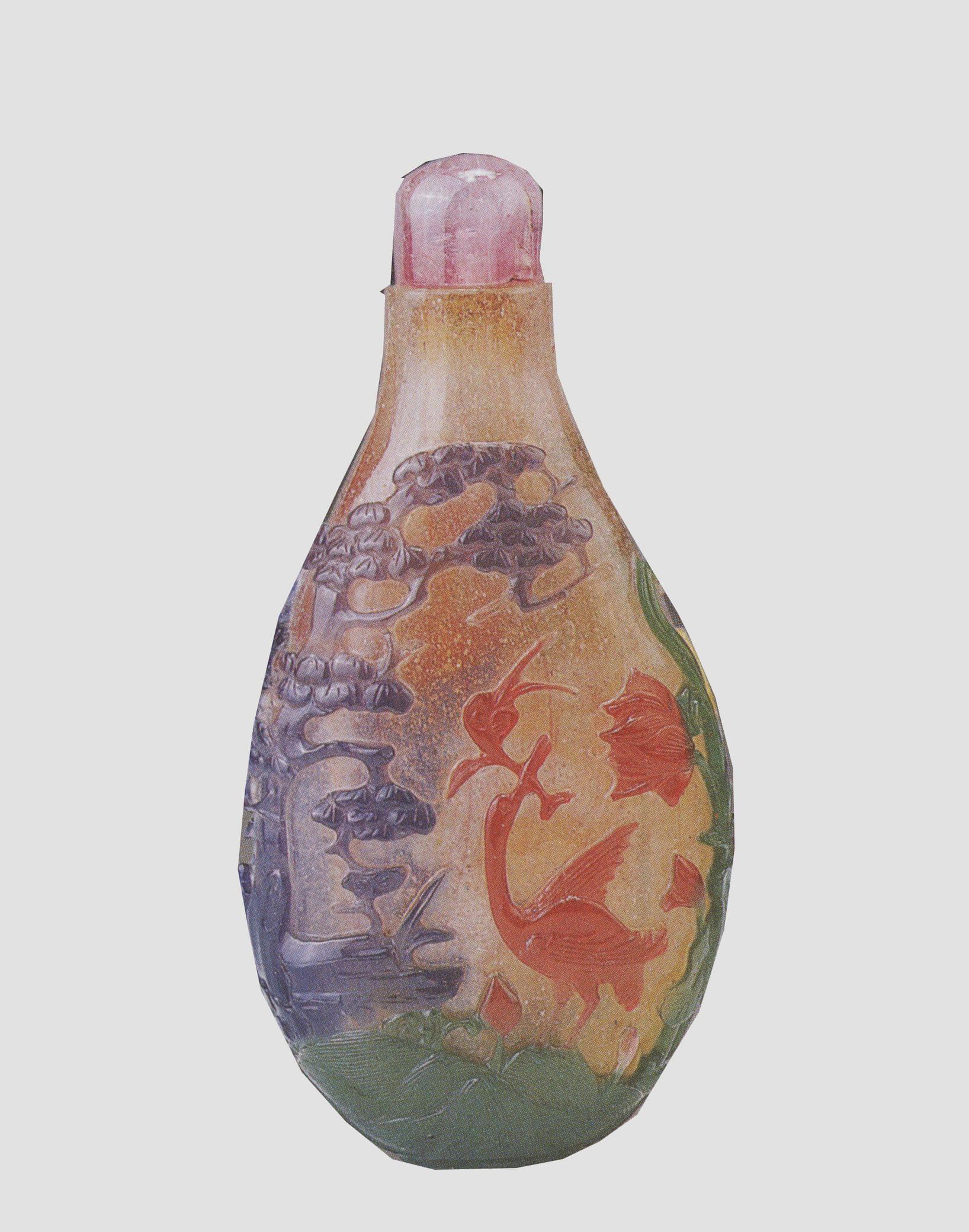 玻璃胎,在半透明玻璃上套红、黄、蓝、绿、紫五色玻璃。壶长颈、斜肩,矮圈足,上配粉色碧玺盖。一面腹部雕绿色荷叶,其绿色蔓枝向上伸至肩部。左侧是用紫色玻璃雕刻成的一棵高大的梧桐树,树下站立一只口衔灵芝的仙鹤,与另一面口叼灵芝的鹿构成“鹤鹿同春”的图案。此壶色彩丰富,构图饱满,寓意吉祥。