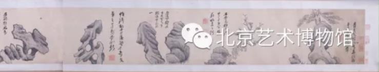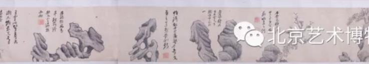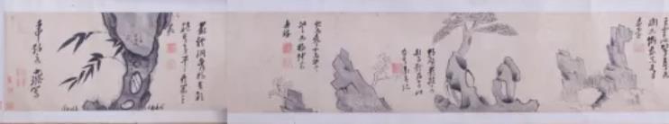 这幅《竹石图》,以写意画法绘松、杂树、怪石、水涧、竹石小景八帧,并自题:“ 贵其高干,而有华纹。非吾石丈,谁与同群?” “石介已极,木澹无过。世间藤藓,将若之何。”“忽闻水声,出自石间。天下端凝,无如断山。” “惟澹故远,非简不奇。文章之道,想亦如斯。”“應龙欲飞,商羊起舞。缊然而云,滃然而雨。” “巨灵所擘,五丁为开。九仙最高,是平远台。”“静质严干,奇形正体。得道以安,其寿莫纪。” “大雨尧尧,小而草草。此之为物,神采返琢。” “严体洞胸,物若口诡。其旁竿竿,竹箭之美。” “壬申(1632年)初夏,元璐写。”钤印:倪元璐印(白文)七次;鸿宝(朱文)六次;元、璐(朱文连珠)。