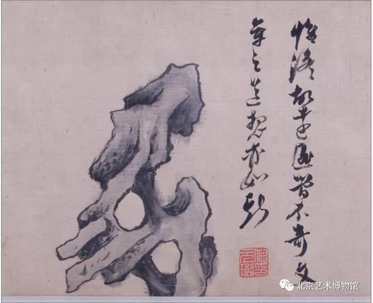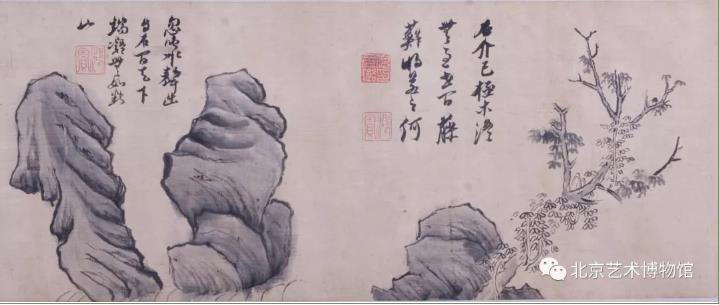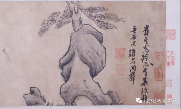 赏析倪元璐的作品,我们可以感受到画面洒脱恣纵,磊落高迈的意态。在艺术语言——笔墨的运用上,倪元璐可谓是得心应手,笔意顿挫自如,线条的擒纵由心,貌不经意,都很自然地展露出“新理异态”(康有为语)的风貌。画面自题的行草,似乎不衫不履,支离粗疏,有些字也几不可识,但体态奇拙,墨迹淋漓、疏宕浑厚,颇得宋代文豪苏东坡的笔意,清代著名书画家和评论家秦祖永曾评价:“元璐书法、灵秀神妙,行草尤其超逸。”在此画中可略见一斑。
