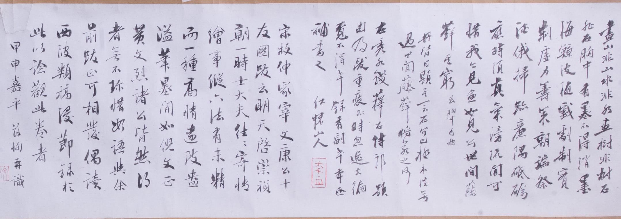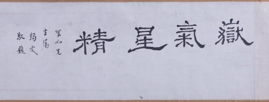 此手卷除画幅外还有引首和数段跋文。引首有题:“岳气星精” 厚如先生嘱,蠲叟敬题。据考“厚如先生”或为苏宗仁,苏宗仁又名苏厚如,北京人(原籍安徽黄山市黄山区)。著名收藏家、文物鉴赏家。收藏甚丰。其中捐献给中国历史博物馆的“北宋百一砚”影响最大。“蠲叟”为“马一浮(1883~1967),幼名福田,字一佛,后字一浮,号湛翁,别署蠲翁、蠲叟、蠲戏老人。浙江会稽(今浙江绍兴)人,中国现代思想家、诗人和书法家。”他是浙江大学原教授,引进马克思《资本论》的中华第一人,与梁漱溟、熊十力合称为“现代三圣”(或“新儒家三圣”),现代新儒家的早期代表人物之一。马一浮于古代哲学、文学、佛学造诣精深,又精于书法,合章草、汉隶于一体,自成一家。曾应蔡元培邀赴北京大学任教。建国后,任浙江文史研究馆馆长、中央文史研究馆副馆长。