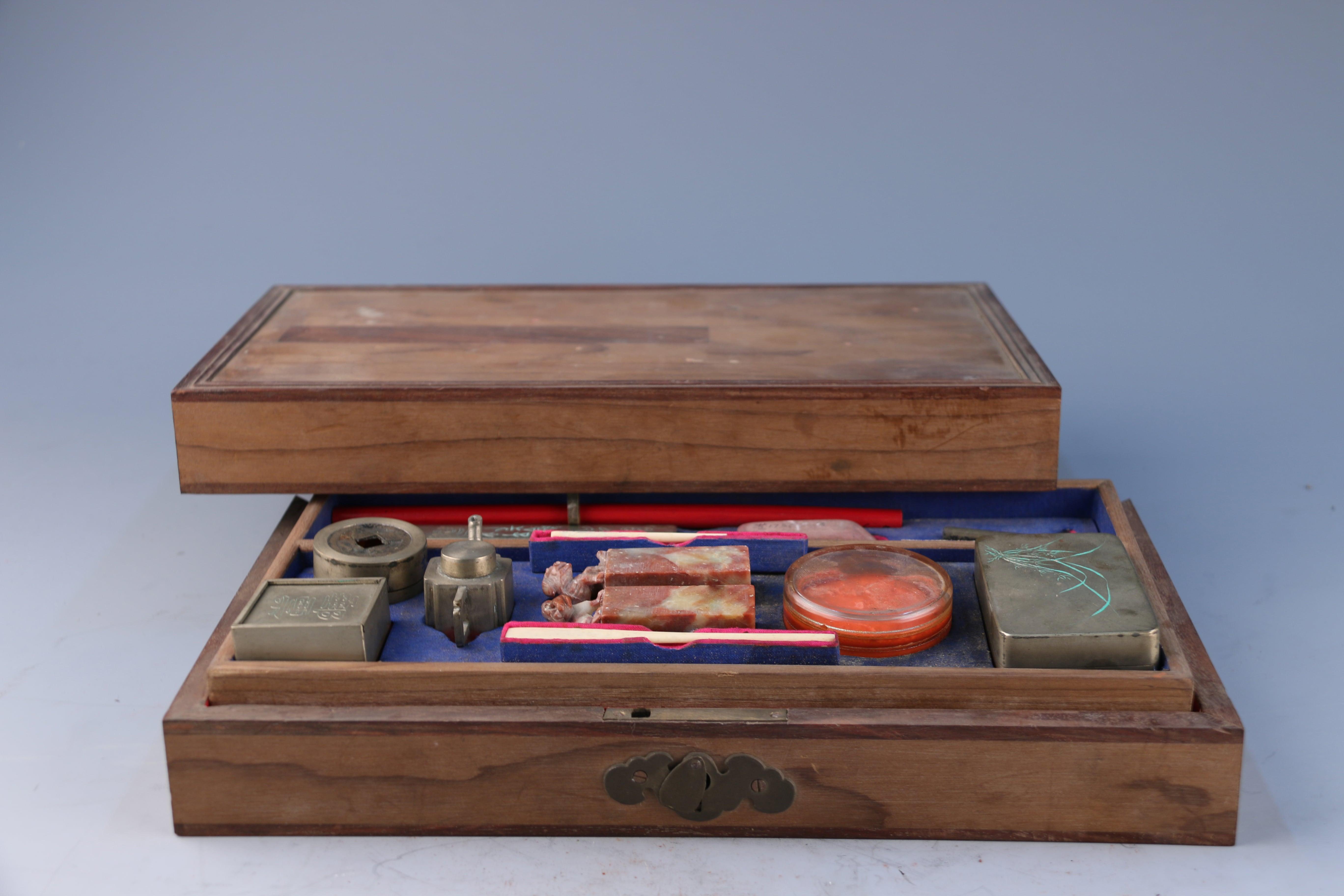 文具盒里除了毛笔、印章、镇尺、印泥等传统文具用品外,还配有中华铅笔和橡皮。