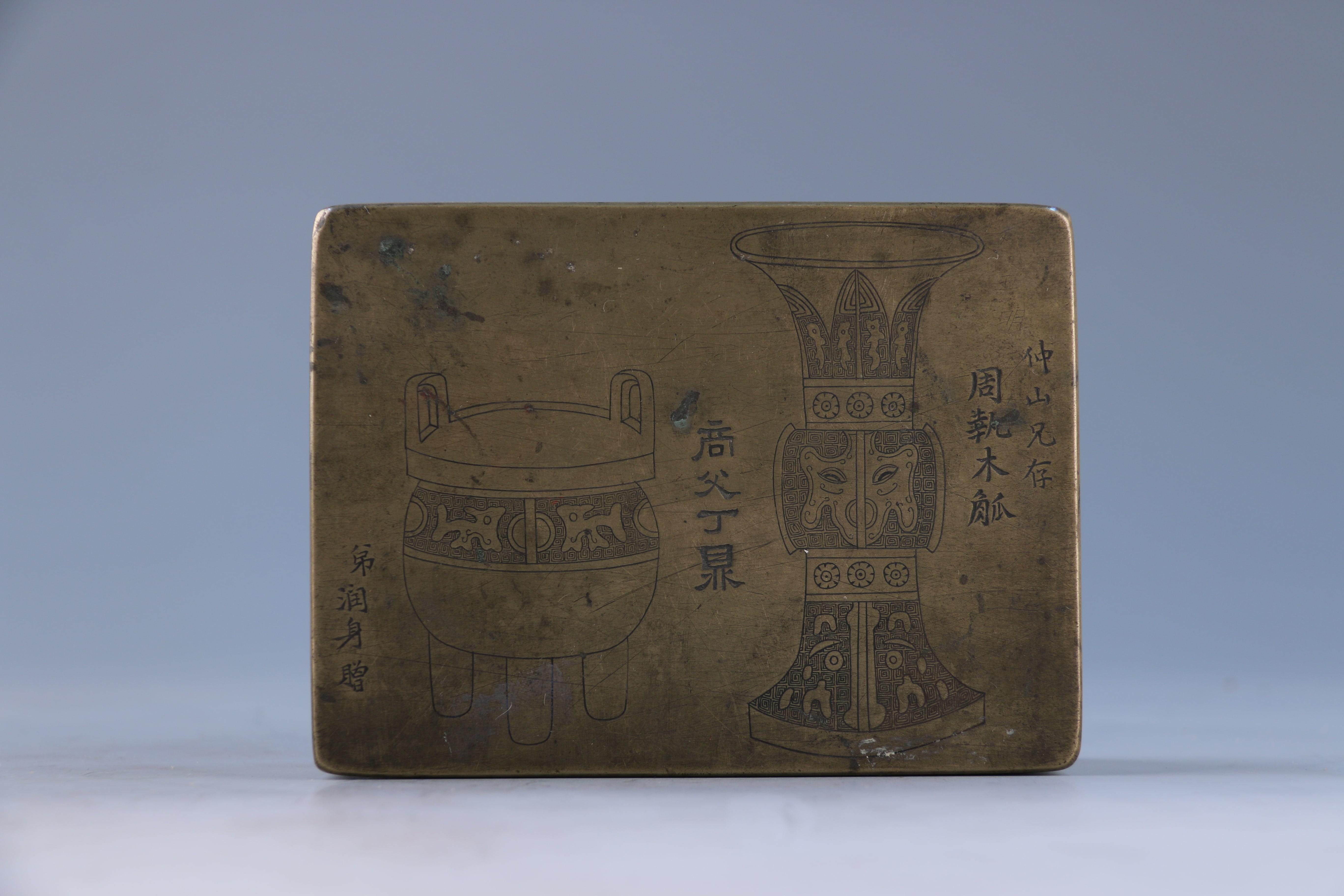 这是北京艺术博物馆藏的另一个刻博古图案的铜墨盒,上刻“仲山兄存”和“弟润身赠”的字样,墨盒成为好朋友间的馈赠佳品。