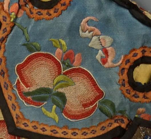 最下层为红色缎地,采用三蓝配色,以打籽绣法绣制“暗八仙”图案,即鱼鼓、宝剑、笛子、荷花、葫芦、扇子、花篮、玉板,用其代表道教中的八仙,寓意吉祥。暗八仙周围以戗针、套针等针法绣制四季花卉及蝙蝠纹样,象征四季常青,福寿安康。整件云肩色彩秀丽典雅,绣工细密整洁,堪称清代云肩中的佳品。