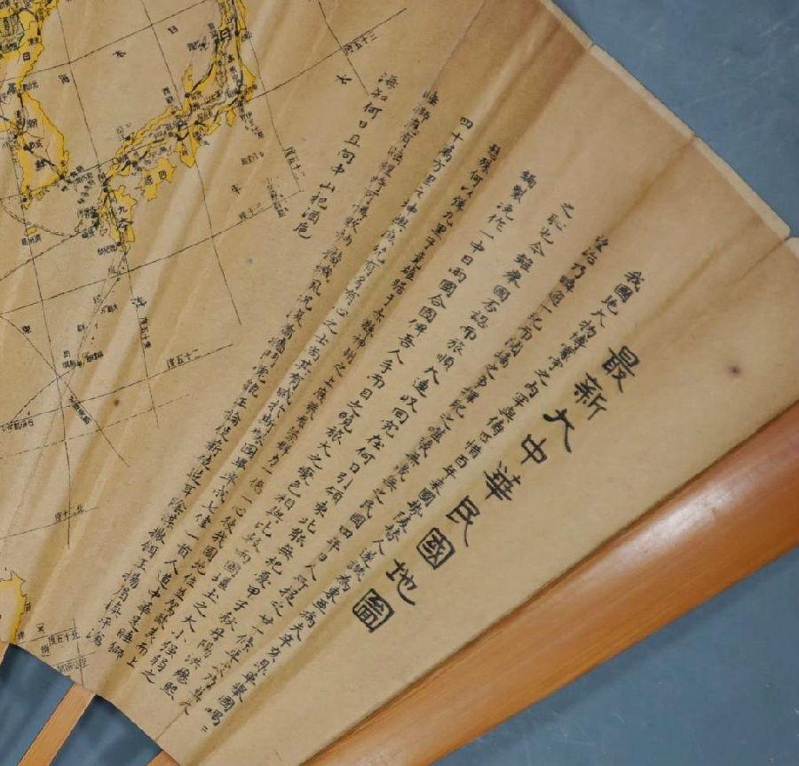 北京艺术博物馆藏民国地图成扇一柄,竹制扇骨。正面为彩色《最新大中华民国地图》,图中比例尺分别以中国尺和英尺标注。图末“中华民国十三年九月初版有著作版权不许翻印 丹阳洪懋熙并识 南京刘霖记发行”,可知该扇印制时间为1924年,制图者为民国时期著名地图出版家洪懋熙。
