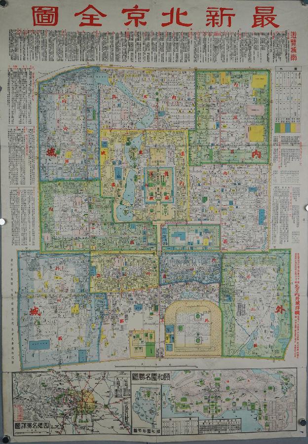 古代北京城市地图,流传下来并保存至今约几十种,且以清代绘制为主。民国以后,地图的出版和使用达到了前所未有的发展,地图从官方走向了民间,走进了大众日常生活。北京艺术博物馆藏《最新北京全图》详细记录了民国时期北京城的整体面貌。城区部分按照内城六区、外城五区方式标注了分区。图例标注城门城墙、铁道、电车路等21项,另以颜色标注教育机关、慈善事业、机关团体、古迹名胜和著名处所五类机构位置,方便游客寻访。