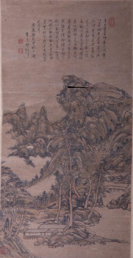 画面自题:子久画,全师董、巨。用笔以苍润秀逸、布景以幽深浑厚为主,凡树枝转折, 余生平所见大小卷轴不下数十帧,无一相同。盖其灵机独诣,变化纵横毫无辙迹可寻。学者能以此处真参实悟,自寻妙谛非规规形似所能几及万一也。余作此图只能粗解其意趣,然资质钝劣,不免效颦之诮耳。 康熙癸已(1713年)中秋下瀚,麓台祁,年七十有二。