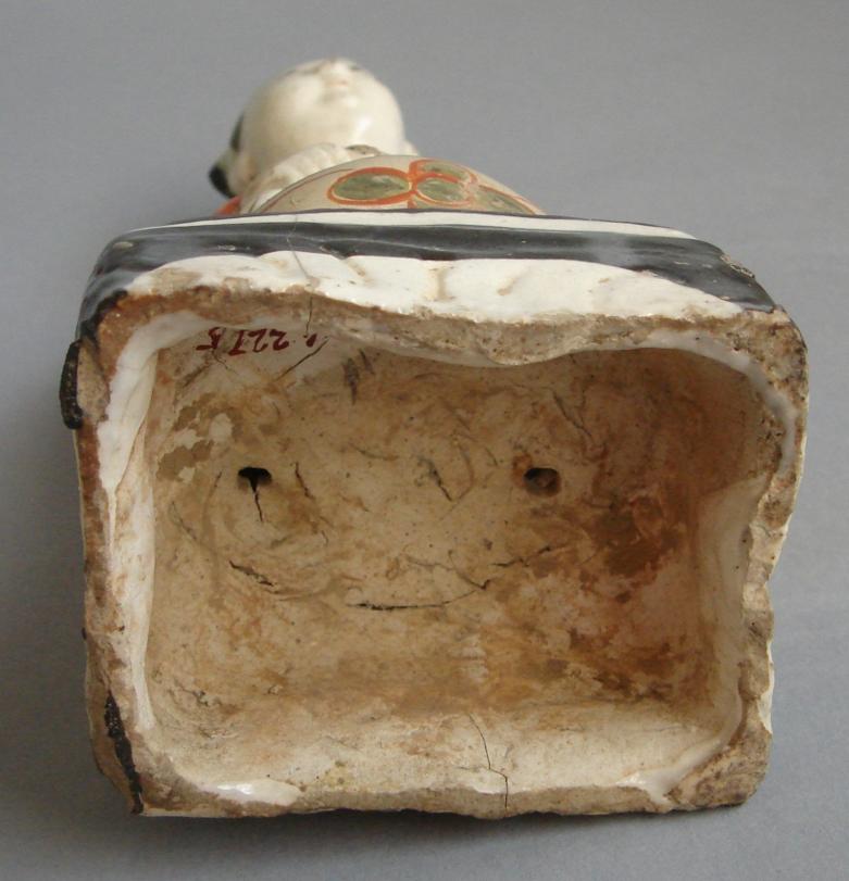 此童子像的底座中空,无釉露胎,并在顶板上留有两个圆形出气孔。(图5)从开脸、施彩、装饰风格及工艺特征看,此童子像与现藏于河南省文物考古研究所的一件金代红绿彩童子像(1974年出土于河南省禹州市钧台窑址)颇为相似,故判断其产地可能是河南的窑场。河南除了当阳峪窑外,获嘉县、博爱县、沁阳市、新乡市等地的窑址上也发现过红绿瓷器的标本,它们虽为残瓷碎片,但却足以证明了当时红绿彩瓷烧造的盛况。