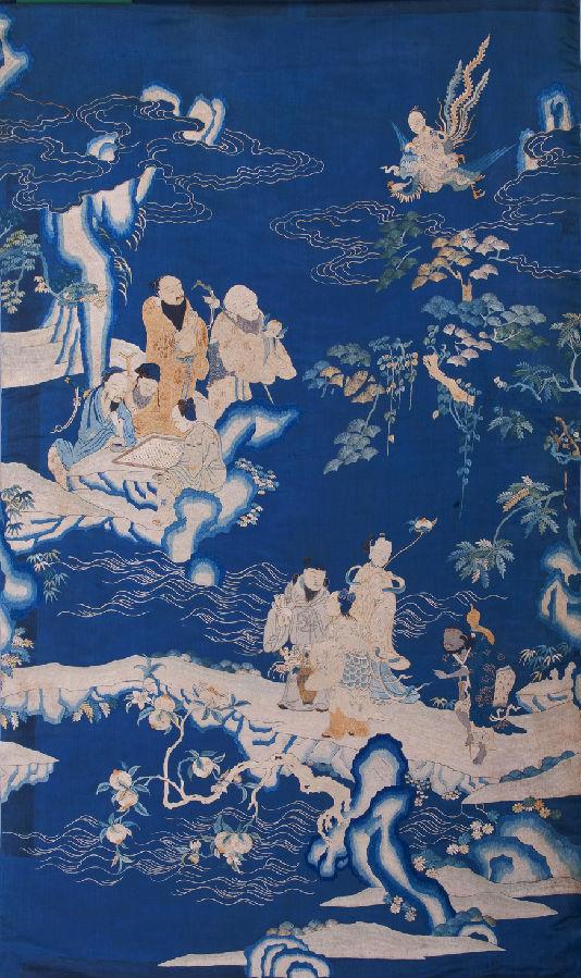 “寿”是中国吉祥文化中的一个重要主题,在织绣装饰中十分常见。北京艺术博物馆收藏的清代蓝绸地苏绣群仙祝寿绣画即是一件以寿为主题的刺绣精品。此件绣品纵130厘米,横74厘米,在蓝色绸地上以细腻的针法展现了八仙与寿星等仙人为西王母祝寿的生动场面。