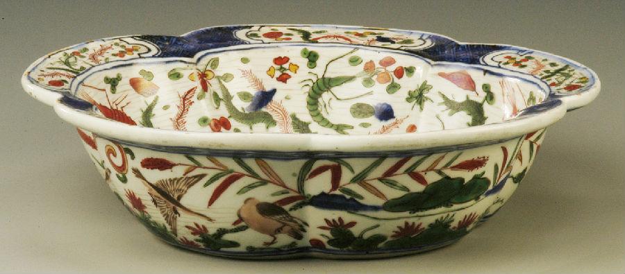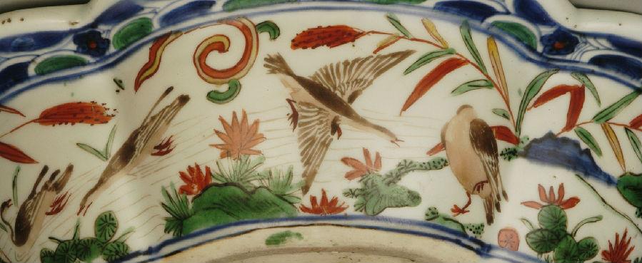 北京艺术博物馆珍藏的明万历青花五彩梅花式洗,即为其中的代表作品之一。口径30厘米,底径17.7厘米,高8厘米。五瓣花口,圆唇,板沿,弧壁,圈足,平底中心内凹。造型富于变化,曲线优美,酷似一朵盛开的梅花,故而得名梅花式洗。