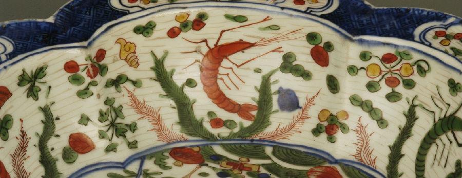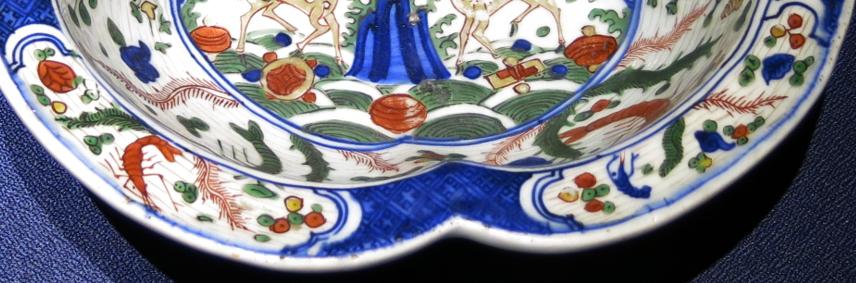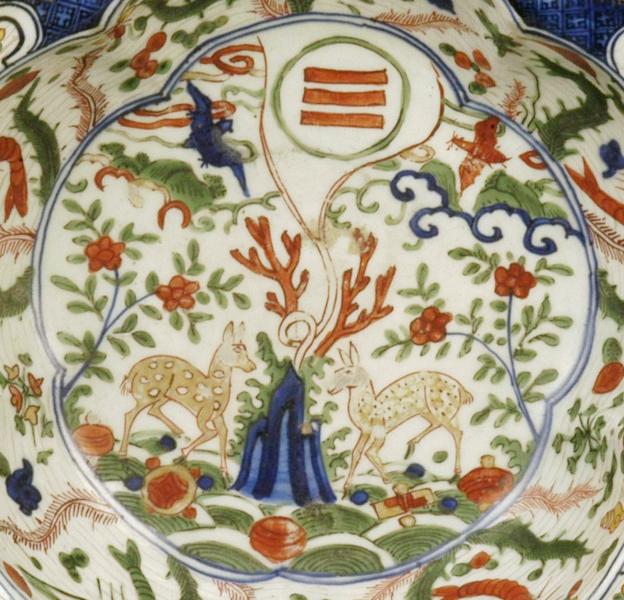 所谓青花五彩,是指以釉下青花画纹饰局部,再于釉上填绘红、绿、黄、褐等彩。这种工艺兴起于明初宣德时期的景德镇御窑厂,发展于嘉靖,鼎盛于万历。其与斗彩的最大区别在于:图案边缘并无青花轮廓线勾勒,而青花也仅仅是起到了其中一种颜色的装饰作用。