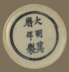 外底书青花“大明万历年制”六字双行双圈楷书竖款。款识书写工整,青花发色艳丽,具有明万历官窑产品的典型特征。