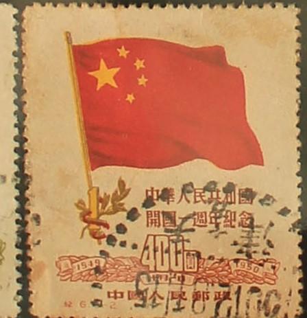 《中华人民共和国开国一周年纪念》邮票是中华人民共和国邮电部为了纪念中华人民共和国成立一周年,于1950年10月1日发行的,志号为“纪6”的纪念邮票。