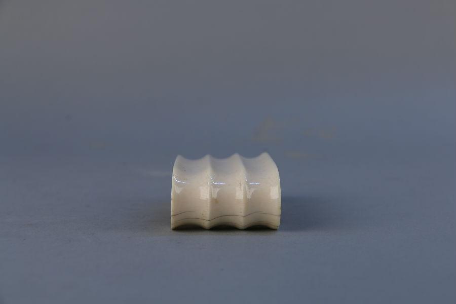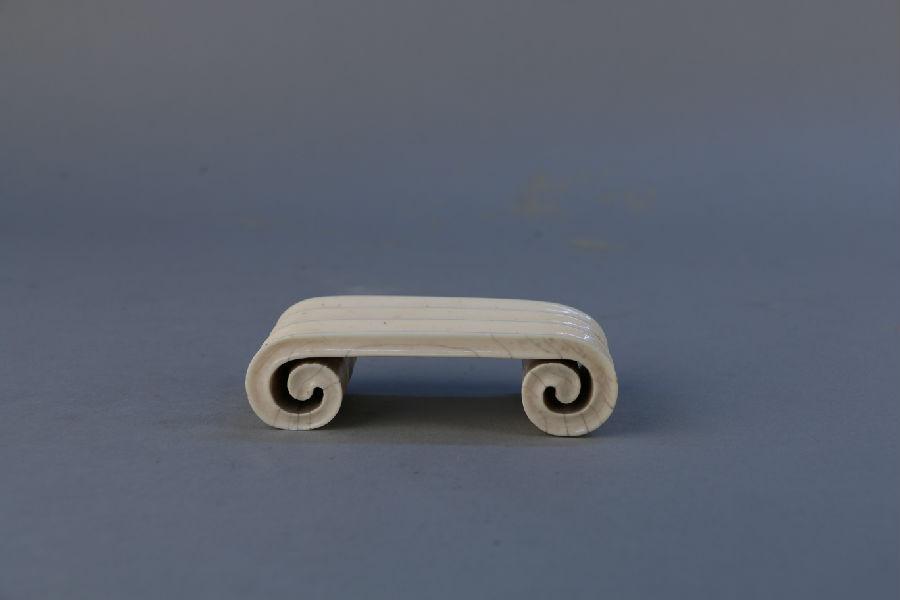 墨床通常被归类为文房器中的墨之属,是研墨时置放墨块儿的用具,清代较为流行。其造型多小巧精致,一般为长方几式或书卷式,或方或圆,或船式等,形式多样。清代墨床的材质丰富,多见瓷、玉石、玛瑙、玻璃、珐琅、竹木牙雕等,以珍贵材质精工细作的墨床并不具有实际使用功能,而是典型的书案清供陈设。馆藏象牙五福捧寿卷足墨床是一件将牙雕技法与文房清供题材相结合的艺术品。初看其造型别致,纹饰素雅,细细看来五福捧寿的纹样又增添了几分吉祥美好的寓意。