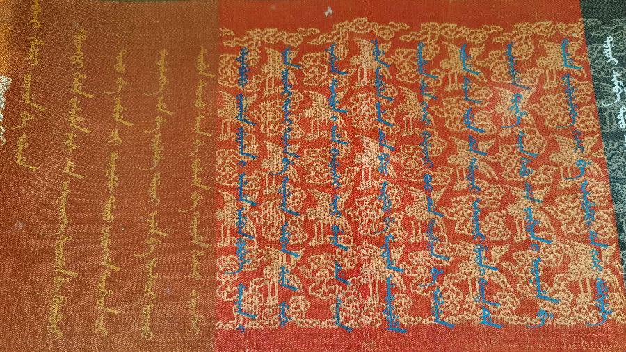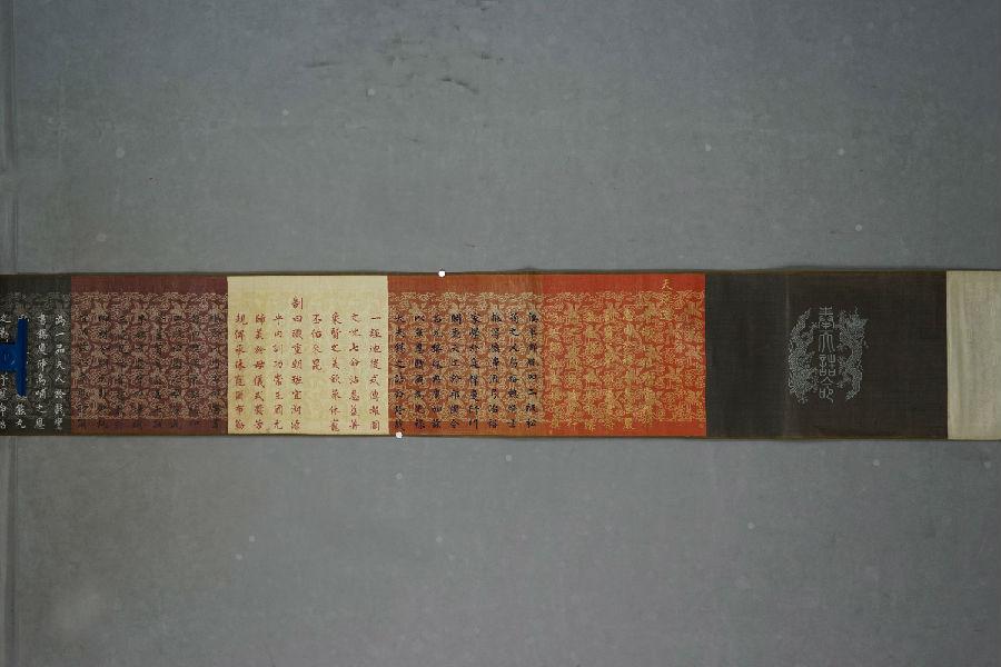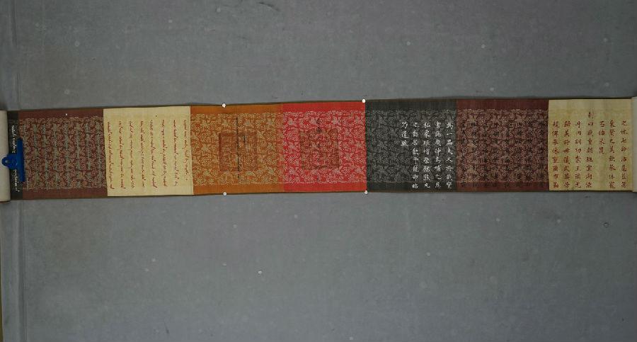 诰命卷轴长477厘米,宽31厘米,织锦地,其上布满提花祥云与仙鹤图案,首尾两端织有头尾相对的升降龙图案,相拥“奉天诰命”四字。卷轴左侧开始处从上至下书汉文“帝字八十号”、“尚书松”、“肆”等字,应为其编号文字,内夹带纸条一张,上书满文“sungyvn改sunyun”。诰命颜色自右至左依次为红、棕、乳白、褐、黑、土黄、桔红、明黄等八种。其内容以满、汉两种文字书写,笔迹颜色光彩夺目,为黄、蓝、白、绿、红、黑六色。汉文自右至左书写39行330字;满文自左至右书写,38行317字,满汉文合于中幅。结尾处题款:嘉庆元年正月初一日,松筠,加盖朱红玺印。嘉庆元年为公元1796年,距今已225年。是年正月初一日,乾隆帝举行禅位大典,颙琰继帝位,即嘉庆皇帝,礼成颁诏天下。松筠父母诰命正是此次覃恩封赠的产物。