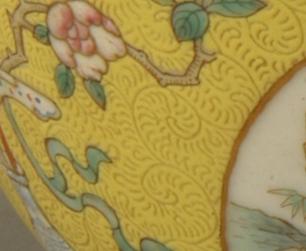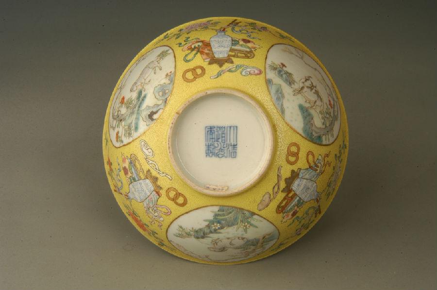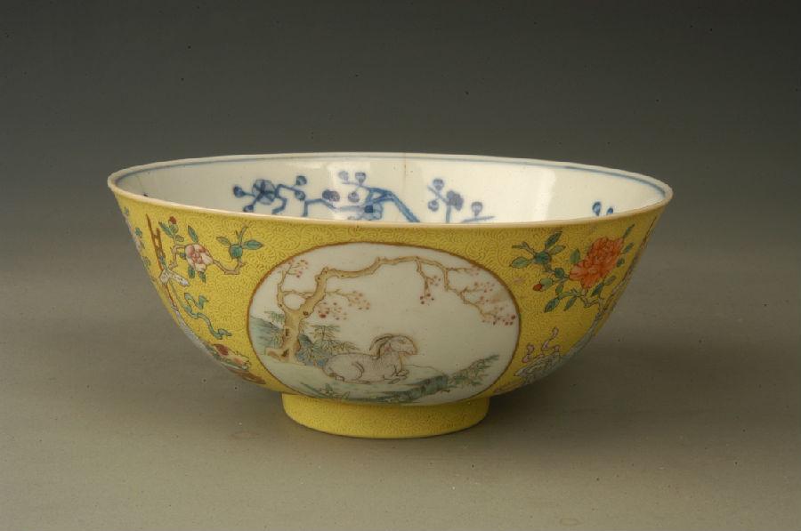 每周一品之一三六:景德镇窑黄地粉彩轧道开光三阳开泰纹碗