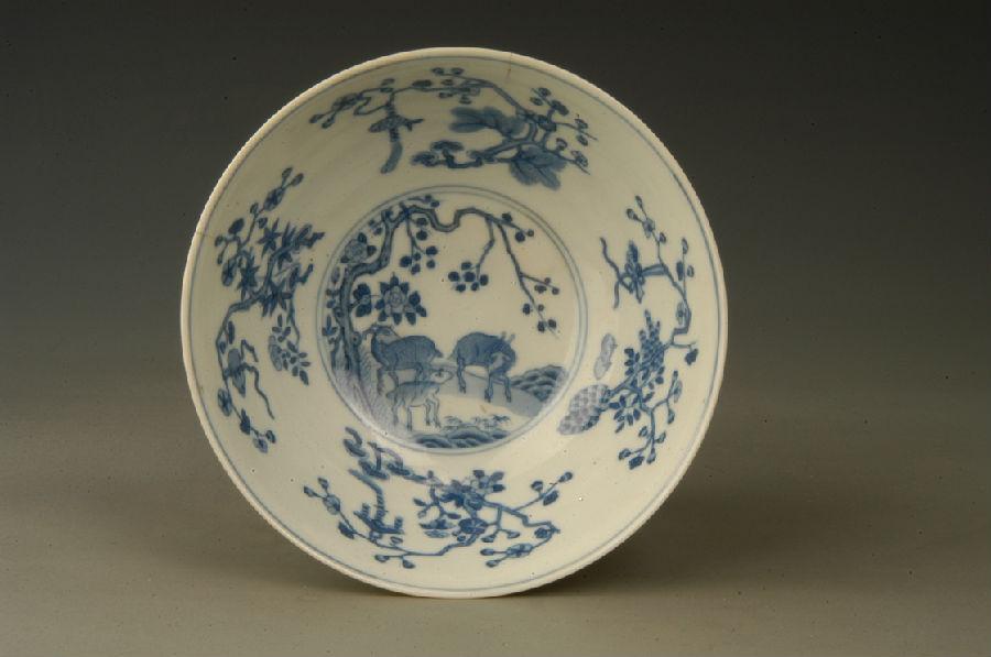 碗外壁开光三个,内绘三羊,羊与阳同音,寓意“三羊开泰”。“泰’是卦名,乾下坤上,天地交而万物通也,大吉。《周易·泰》:“泰,小往大来,吉亨。”阴阳学说中,农历十一月为复卦,一阳生于下;十二月为临卦,二阳生于下;正月为泰卦,三阳生于下。冬去春来阴消阳长,有吉亨兴盛之象,故称“三阳开泰”。《宋史·乐志》:“三阳交泰,日新惟良。”碗内里青花装饰,内壁绘折枝花果与杂宝组成的吉祥纹样四组——牵牛花与葫芦寓意“福禄绵长”,柿与如意象征“万寿如意”,磬与鱼相对、寓意“吉庆有余”。碗心双圈内绘三羊,同样寓意“三羊开泰。”