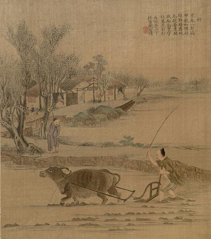 《耕织图》是中国农桑生产最早的成套图像资料,它的绘写渊源可上溯至南宋绍兴年间,楼璹绘制《耕织图》呈献给宋高宗,深得高宗赞赏。康熙二十八年(公元1689年),康熙帝二次南巡时,意外得获南宋楼璹《耕织图》,感慨织女之寒、农夫之苦,遂命内廷供奉焦秉贞以楼璹原作为基础重绘《耕织图》。康熙不仅每图亲题七言律诗一首且于图前亲书序文,并于序首,序尾盖印。后来雍正皇帝又命画师参照楼璹《耕织图》和《御制耕织图》绘制耕图、织图各23幅,并亲自各题五律诗一首。乾隆皇帝不仅命人绘制《耕织图》,并且将《耕织图》中的美景用实际山水复原出来,把关系到国计民生的衣食之本,用艺术与现实相结合的手法镶嵌在清漪园绚丽的湖光山色之中。