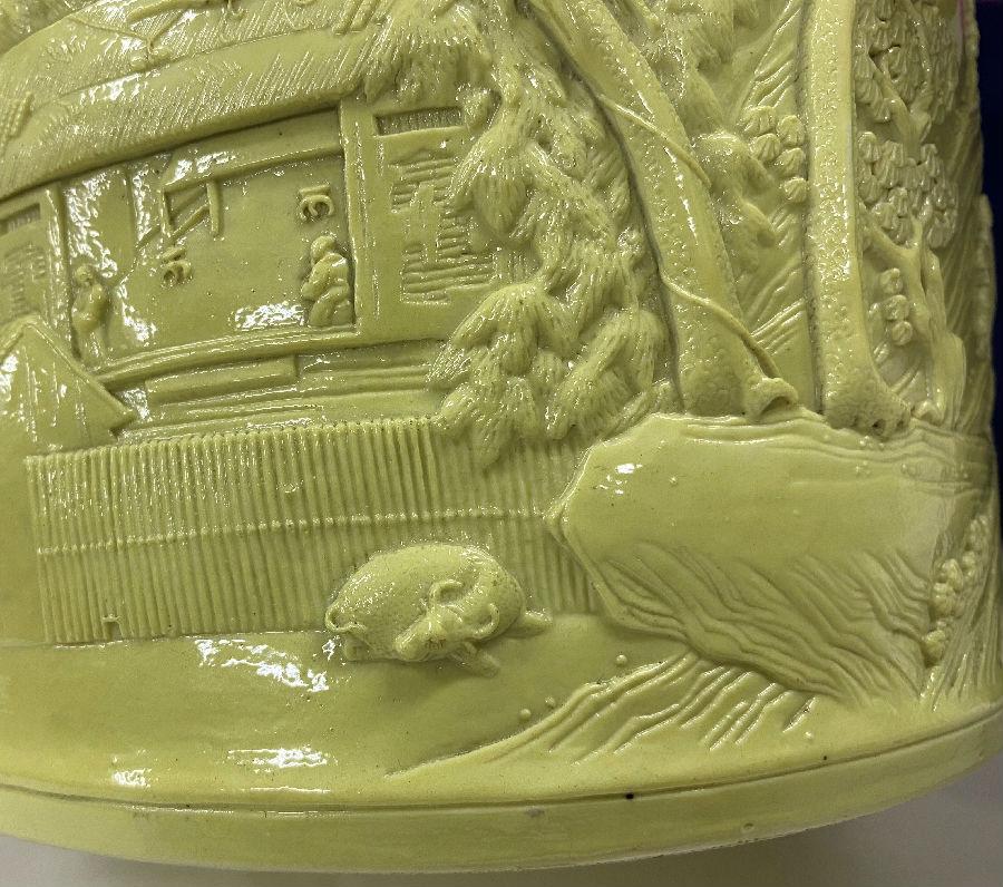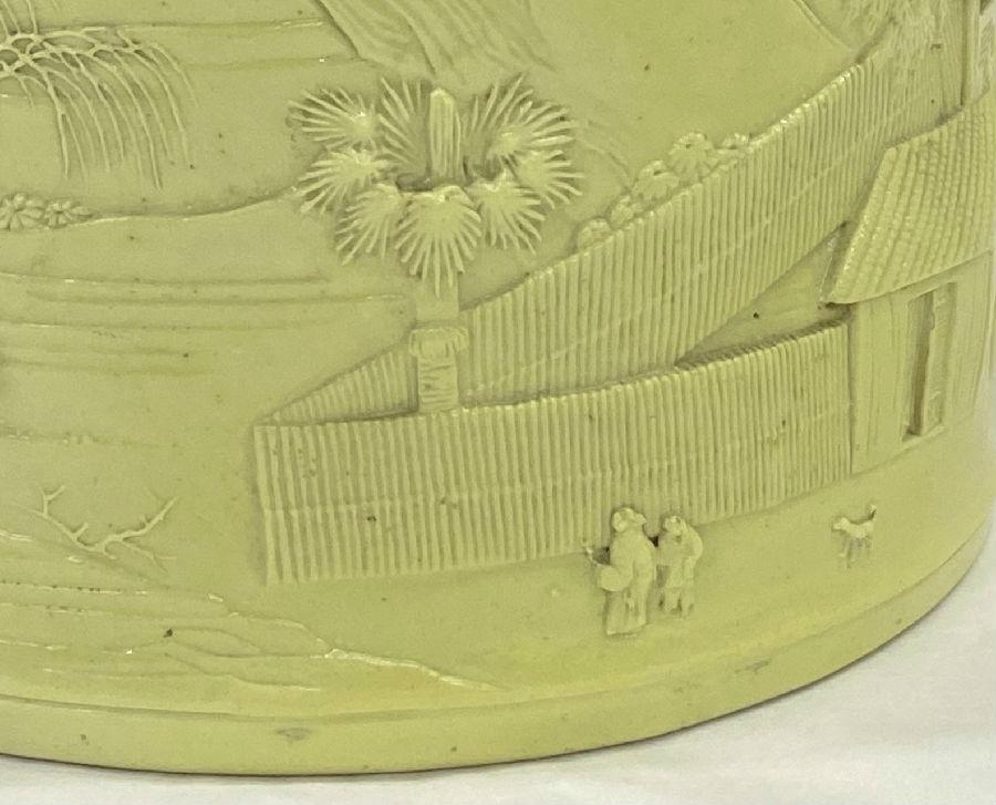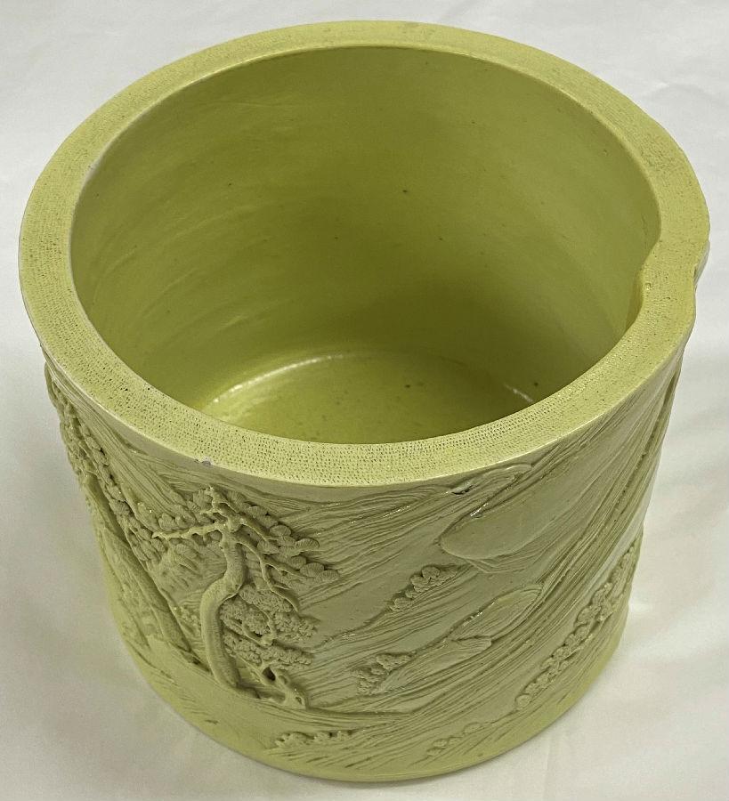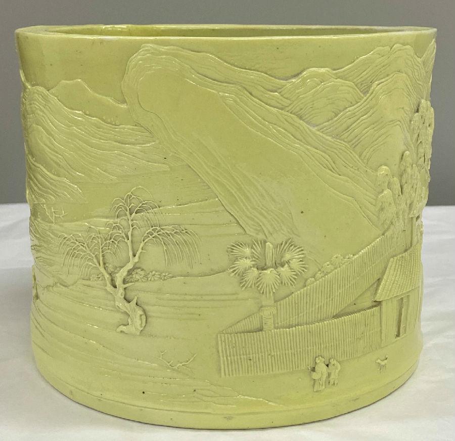 北京艺术博物馆藏清黄釉雕瓷山水人物纹笔筒:口径17×16.3厘米,底径16.4×16.1厘米,高13.5厘米。(图1)