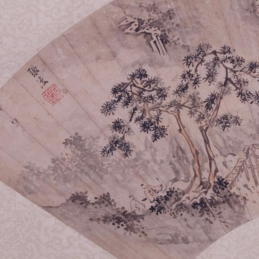 此幅金笺扇面为小写意水墨设色山水画,绘山中古刹,瀑布湍流,山下江边有栈桥草亭,亭中一人与江中荡舟的渔夫子对话之景,近处两位高士相互攀谈,预过草桥。此幅扇面用笔松散,仅近处两处松柏与远处山间松树露出的古寺着墨较多、形成三角形稳定构图,远山和杂草、江中渔夫寥寥几笔仅用淡墨晕染,颇有韵律,整体画风较为疏放。款属“张复”,但却钤“原起”(即刘原起)白文印,似是此扇面为二人联合创作。