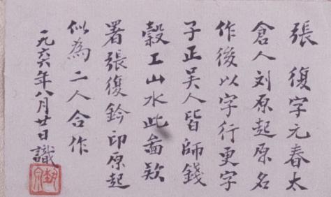 下有补文“张復,字元春,太仓人,刘原起,原名作后以字行更字子,正吴人皆师,钱榖工山水,此面亦属张復钤印原起,似为二人合作。一九六六年八月二十日识”。