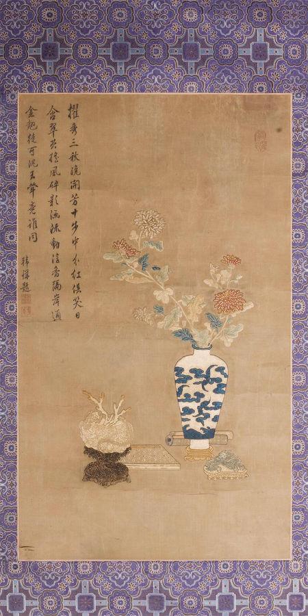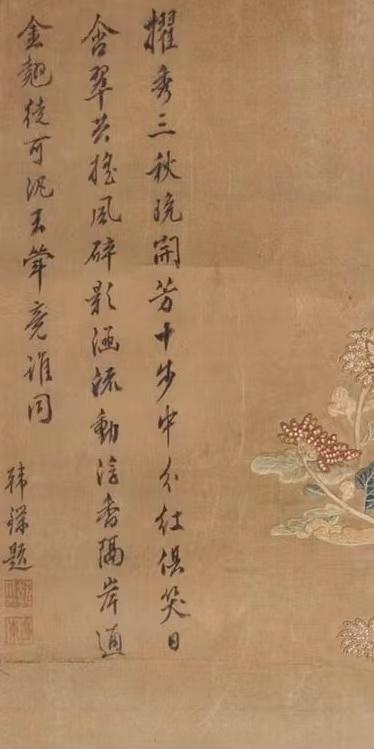 绣画左上方有墨笔题书唐初诗人骆宾王的《秋晨同淄川毛司马秋九咏·秋菊》:“擢秀三秋晚,开芳十步中。分红俱笑日,含翠共摇风。碎影涵流动,浮香隔岸通。金翘徒可泛,玉斝竟谁同。”与画面的内容相应和。诗题末尾有“韩鑅”名款,并钤“韩印”“序东”朱印。画面右上角另有一“明窗净几”印。