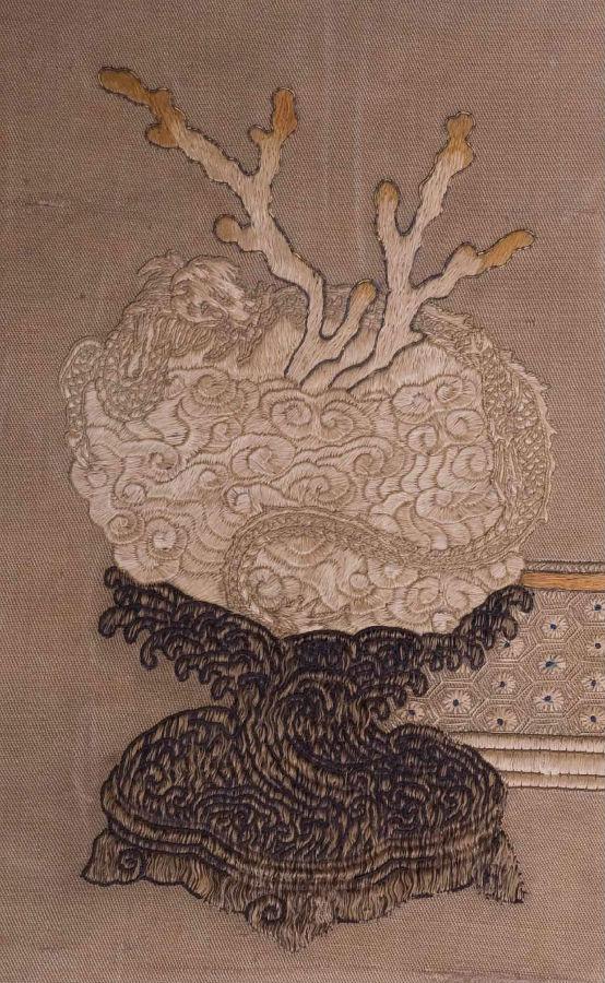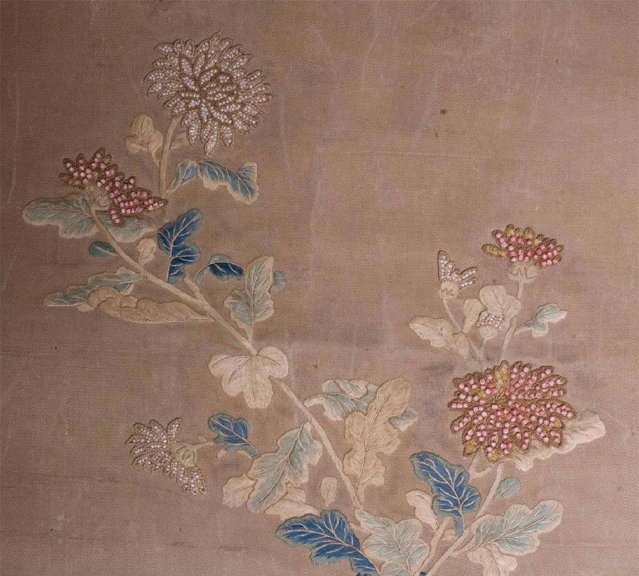 米色江绸地苏绣博古图镜心为清代同治时期的一幅画绣作品。绣品以米色江绸为地,采用苏绣技法绣插花博古图案。图中近处摆放一云龙纹水盂,当中插珊瑚为饰,其旁放置一块如意足龙形盖砚,稍远为一云蝠海水纹青花梅瓶,瓶中插有数枝花叶繁茂的菊花。瓶、盂之外,另有两轴手卷与一本书函散布。图中的器物虽不多,但排布摆设错落雅致,富于意趣。为了细致表现各种器物的纹理质感,除了大面积的平绣外,绣画中还灵活运用了多种刺绣技法:如以钉线绣勾勒花瓶、木座等器物的边缘轮廓,突出其空间的立体感;又如用极小的珊瑚珠和珍珠以穿珠绣绣菊花花瓣,花朵精巧生动,形象饱满。整幅作品构图疏朗,色彩清雅,绣工细致,针法灵活,完美地体现了“博古”的高雅主题。