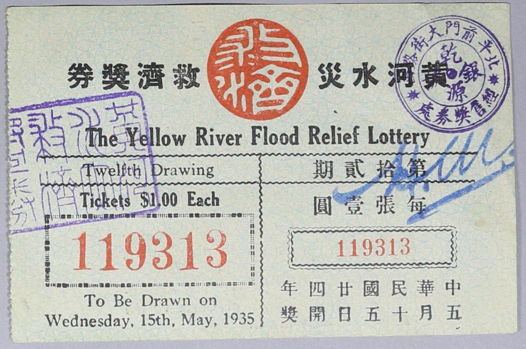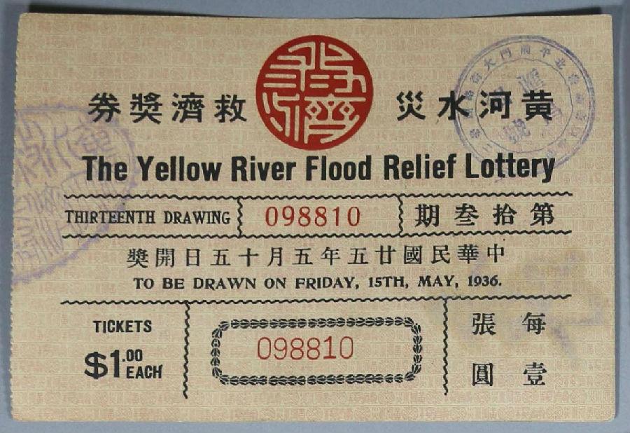 1933年,黄河中游地区发生了严重的洪水灾害。为筹集资金救助灾民,河北省黄河水灾救济委员会发行“救济河北省黄河水灾奖券”,形式类似于清末变资助赈,奖项为爱心人士捐赠的房屋及古玩字画等实物。1934年更名为“黄河水灾救济奖券”,奖项改为五等不同数额的奖金。至1935年5月,“黄河水灾救济奖券”共发行12期。此后停发一年,1936年4月发行第十三期,至1938年第三十四期停售。