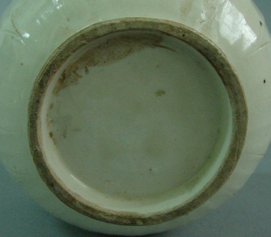 壶腹部剔刻仰莲瓣纹。莲瓣为三层重叠式,最上层的莲瓣以深剔刻技法制成,瓣尖轮廓分明,凸起于胎面。工艺娴熟精湛,运刀如运笔,风格犀利洒脱,具有浮雕效果。
